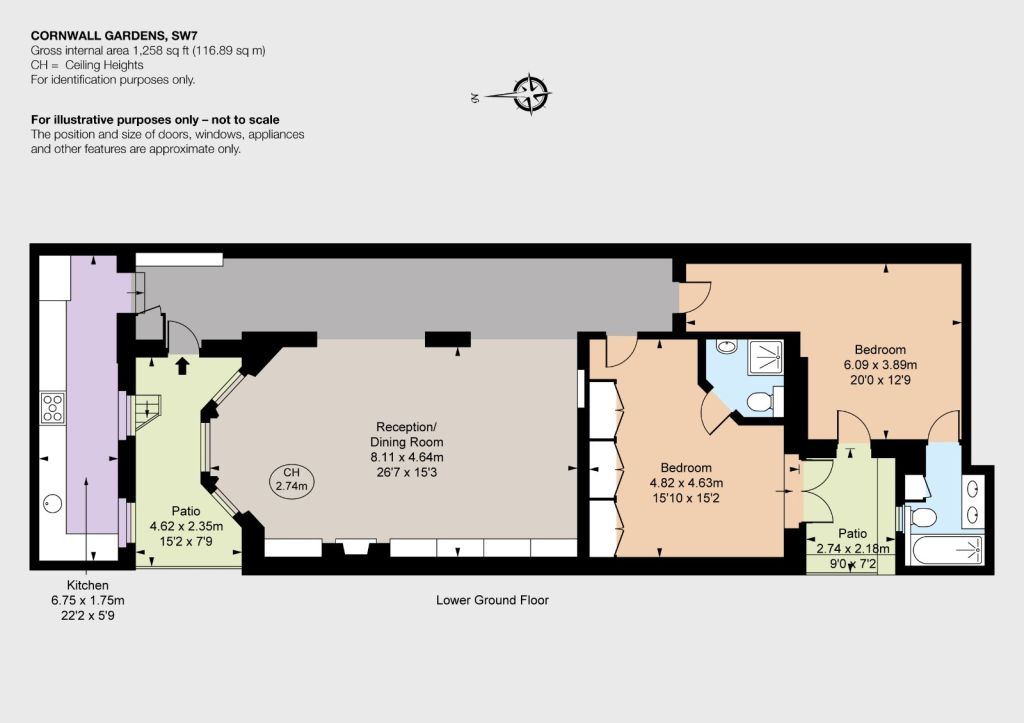 An extremely spacious two-bedroom flat on Cornwall Gardens, extending to over 1200sqft, in excellent order with fresh decor and wood flooring throughout. The separate kitchen is well proportioned and fully equipped. There are two generous bedrooms, both with ensuite bathrooms and excellent fitted storage in the principal bedroom.