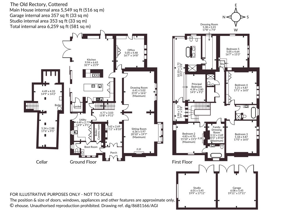 A sweeping staircase rises to a galleried landing leading to five well-presented double bedrooms. The principal suite enjoys panoramic garden views, with an open en suite with bath, walk in shower and twin basins, alongside a bespoke dressing room. A second bedroom is en suite, with a family bathroom and separate shower room serving the remaining rooms.