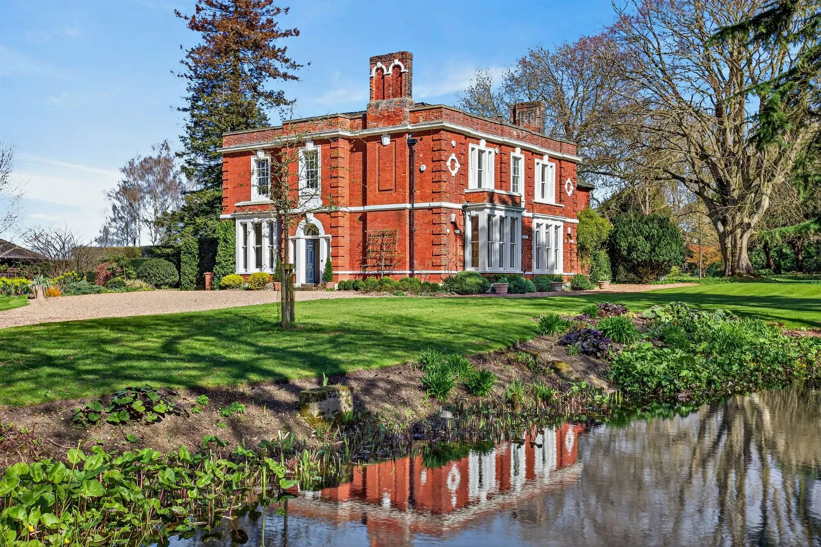 The property sits within extensive, beautifully maintained grounds, formerly part of the National Garden Scheme and divided into several ‘rooms’ including an herbaceous garden, rose garden, perennial garden and an ornamental kitchen and cutting garden. A tree-lined driveway leads to the gravelled parking area and a detached garage with studio overlooking the extensive lawns. A wooded backdrop shelters the two substantial ponds whilst adjoining the house is a wide patio ideal for outdoor dining.
