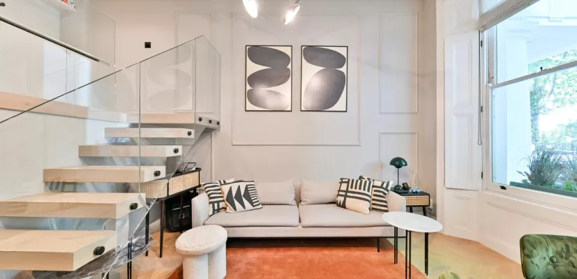 South Kensington Estate & Letting AgentsA contemporary one-bedroom, one-bathroom maisonette located in the sought-after Courtfield House. The modern living room is beautifully decorated, featuring high ceilings and large sash windows that provides natural light and offer picturesque views of the communal gardens.