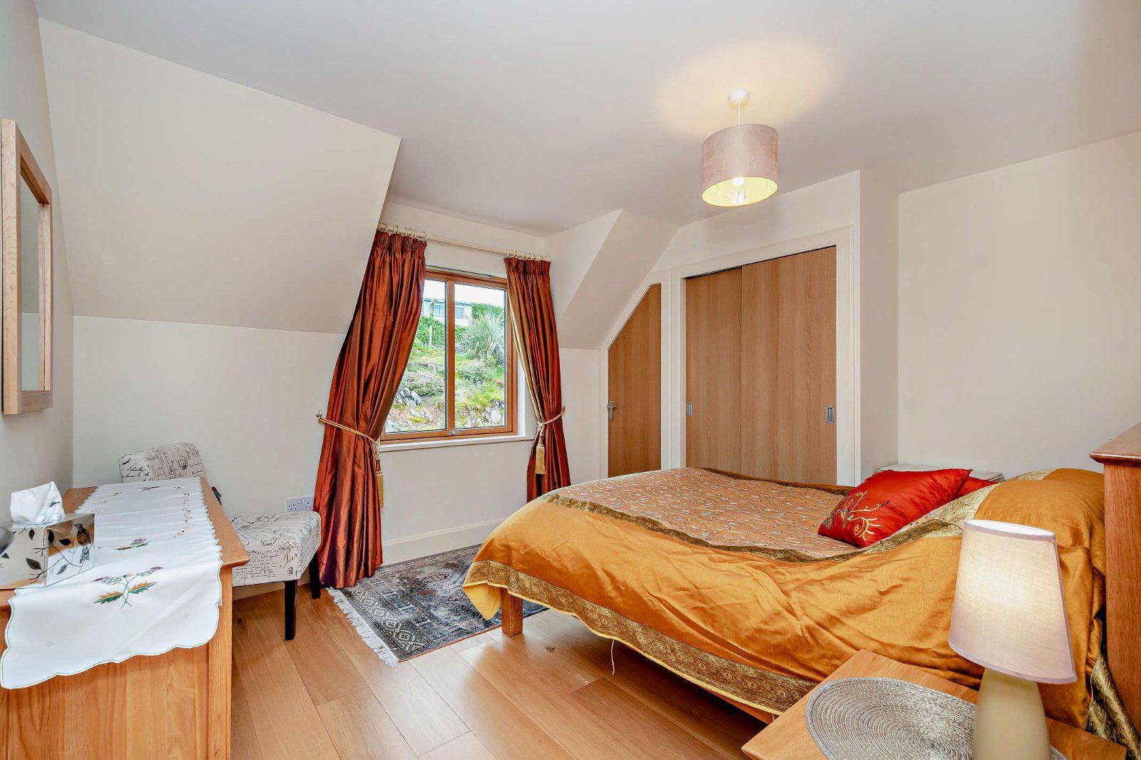 On the first floor there is a stunning sitting area with elevated views across Carsaig and to Jura and beyond. The cathedral-style ceiling creates a sense of space and light, while the sliding glass doors open onto a balcony with a glass balustrade for uninterrupted views. There are four double bedrooms, including the principal bedroom which benefits from its own en suite and dressing room.