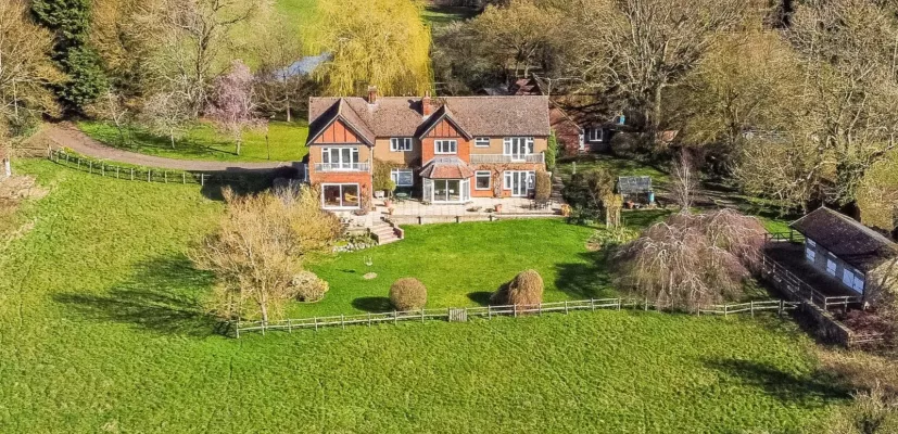 Two further reception rooms include a family room with French doors onto the terrace and an impressive drawing room with a more formal dining area, the latter flooded with light with glazing to three aspects and two sets of doors opening onto the terrace. There is an inglenook fireplace with a Jotul log-burner which add warmth and character. A wide winding staircase set within a turret rises to the attractive galleried first-floor landing. There is a light and airy principal bedroom suite with an en suite bath/shower room and a small balcony that takes full advantage of the far-reaching views across the Mimram valley to Ayot St Lawrence and beyond.