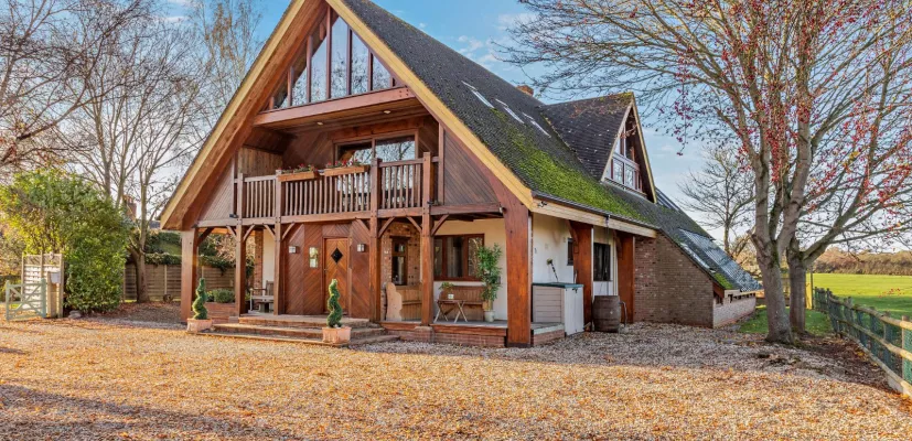 The front door opens onto a ceramic-floored hallway and leads through to a beautiful contemporary kitchen with gloss white cabinetry, honey oak surrounds and quartz worktops. A large central island incorporates a breakfast bar and ceramic hob and the remainder of the well-appointed kitchen includes appliances by Miele, Smeg, and Siemens. Beyond the kitchen is the dining room, the entrance of which is framed by a burr oak arch, which combines oak flooring with exposed brickwork and historic beams. Adjacent is the 'Great Room' which forms the heart of the house. This impressive space is defined by its high cedar ceilings, Venetian plaster walls, and a bespoke fireplace that provides central focus. Concealed within the wall, a cinema television enhances the modern luxury of the setting, while the large Douglas fir windows and cedar shutters frame the room with natural light. The sunroom and adjoining bar complete the downstairs reception areas. The ground floor also includes a bedroom with countryside views and a nearby bathroom and separate WC, offering flexibility for guests or multigenerational living. To the right of the hall, the utility room provides storage and has a Belfast sink. Upstairs, the library and minstrel’s gallery overlook the living spaces with vaulted ceilings, timber beams, and full-height windows. The guest suite has oak flooring, built-in wardrobes, and a marble-finished en suite. The principal suite has walk-in wardrobes, bespoke fitted furniture and a private balcony overlooking the countryside. Stairs rise to a mezzanine dressing room with integrated storage. The en suite features a Jacuzzi bath, twin basins, and a shower and steam room. Lastly, a study, with full-height glazing, and floor-to-ceiling shelving provides the option of a home office or fourth bedroom.