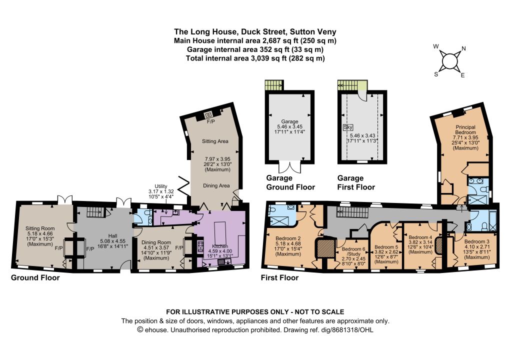 A spacious entrance hall, laid with flagstone flooring and centred around an inglenook fireplace, sets the tone for the accommodation. The principal reception rooms include a well-proportioned sitting room with a fireplace and double French doors opening to the garden, together with a separate dining room featuring a large fireplace.