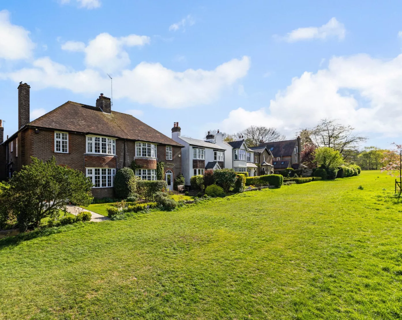 This home enjoys a wonderful setting and outlook, with green and open space all around. Tucked away, the house is set behind an attractive front garden that flows seamlessly onto East Common, allowing direct access to the open space. The property features a traditional brick façade complemented by red clay tile hanging. A paved pathway, bordered by lawns and thoughtful plantings leads to the front door.