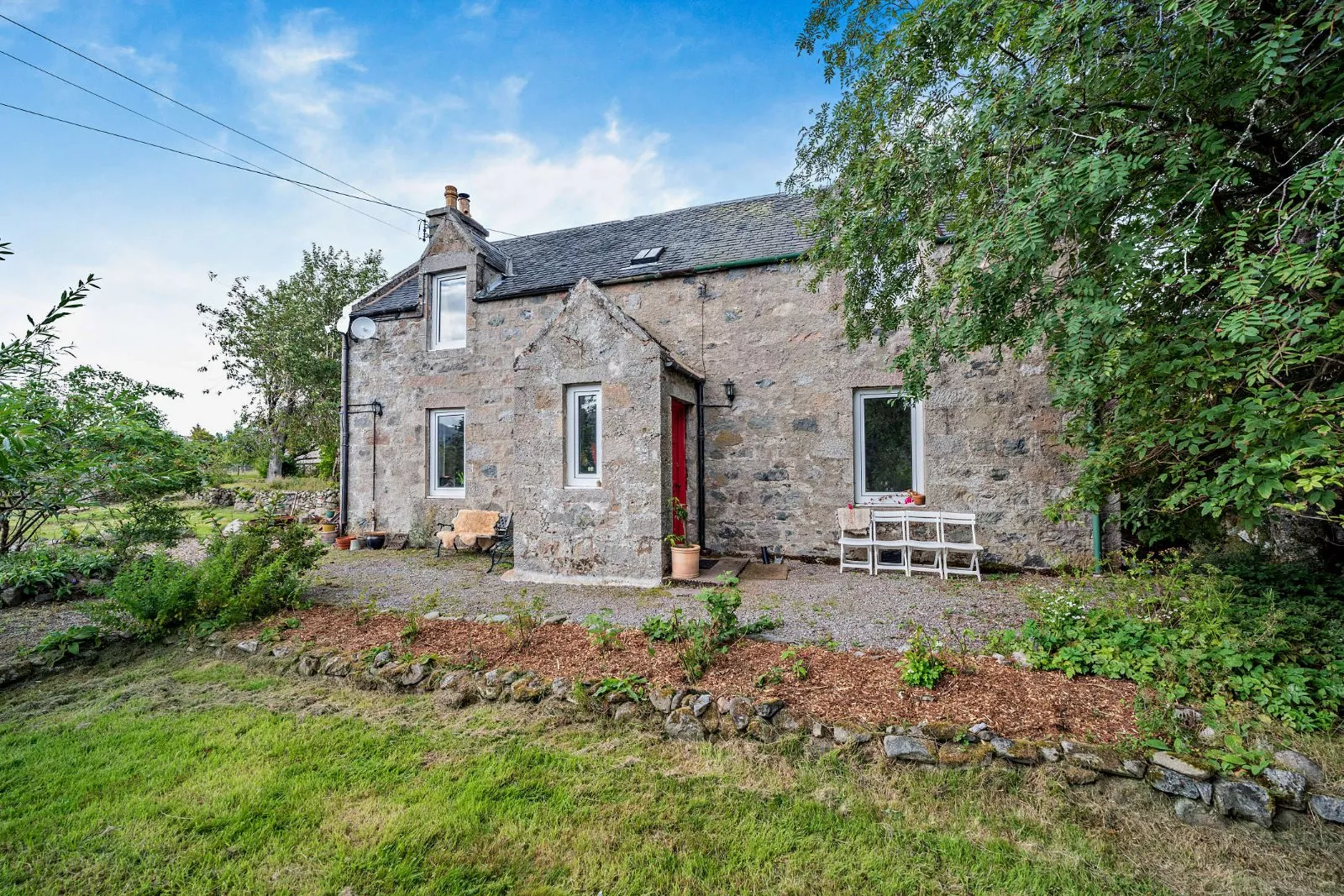 The property sits in approximately 3 acres and is set back from the road with a parking area to the side of the lane providing space for several vehicles. The gardens and grounds are mostly to the front of the property, and feature areas of lawn, a gravel seating area for al fresco dining and a wealth of mature trees, hedgerows and established shrubs, with expansive, far-reaching views towards the towering peaks of the Highlands beyond. There are established fruit trees and fruit bushes including cherry, plum, damsons and blackcurrants.