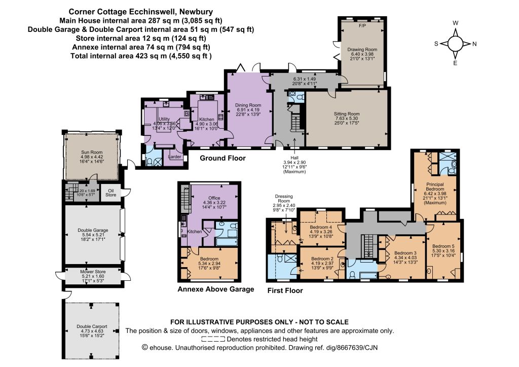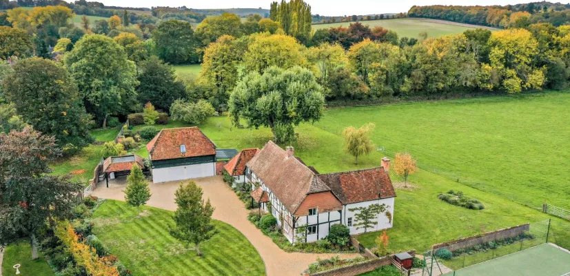 Corner Cottage is a charming and well-proportioned Grade II listed house offering over 3,000 sq ft of attractive accommodation arranged over two floors. Originally dating from the 17th century, it showcases handsome Tudor-style elevations with exposed timber framing and brick infill. Inside, the property retains a wealth of period character, including timber beams and brick fireplaces balanced with modern comfort and practicality. The ground floor offers three generous reception rooms. At the front, the 25ft dual-aspect drawing room centres around a traditional brick fireplace, creating a welcoming focal point. To the rear, the sitting room features a woodburning stove and bi-fold doors opening onto the garden, flooding the space with natural light. The formal dining room also has doors to the terrace and adjoins the kitchen, offering excellent flow for entertaining. The kitchen is fitted with a range of wall and base units and integrated Neff appliances, including a double oven, induction hob and extractor, while a large utility room and walk-in larder provide valuable additional storage. Upstairs, there are five well-presented double bedrooms. The principal bedroom includes built-in wardrobes and an en suite shower room. A further bedroom is also en suite, while three others have washbasins, one within a dressing room. A family bathroom serves the remaining bedrooms, with Jack and Jill access from the third bedroom. Additional accommodation is available in the self-contained annexe above the garage block. It includes a sitting room or office with kitchenette, a double bedroom with built-in storage and a bathroom. This area is ideal for guests, extended family or use as a private workspace or office/gym. A glazed garden room at the rear of the annexe offers a peaceful space to enjoy the outlook.