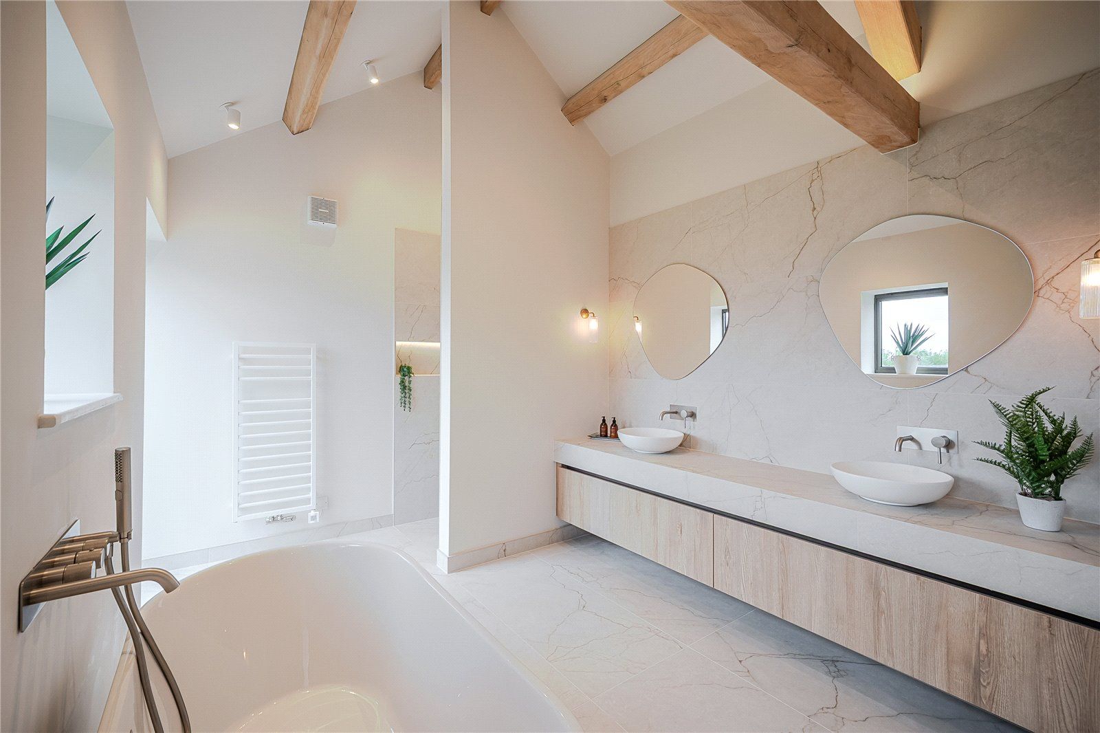 Stairs rise from both halls to two first floor landings, one galleried and overlooking the living space below, reinforcing the barn's open and airy feel. The vaulted first floor houses the property’s three remaining double bedrooms, one with exposed ceiling beams and a contemporary en suite shower room. The two others having fitted wardrobes and sharing Jack and Jill access to an equally refined en suite shower room.