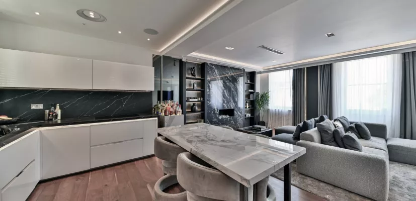 This lateral fourth-floor flat, set within a stunning Portland stone building with lift and resident porter in the heart of Knightsbridge has been impeccably refurbished to the highest standards, showcasing the finest luxury materials and Poliform woodworks throughout. It features a BOFFI kitchen with Meile appliances, bespoke large-format Italian stonework, and state-of-the-art home automation. The air-conditioning, heating , LUTRON lighting , and multi zone speaker system are seamlessly integrated and can be controlled via tablets or a mobile app.