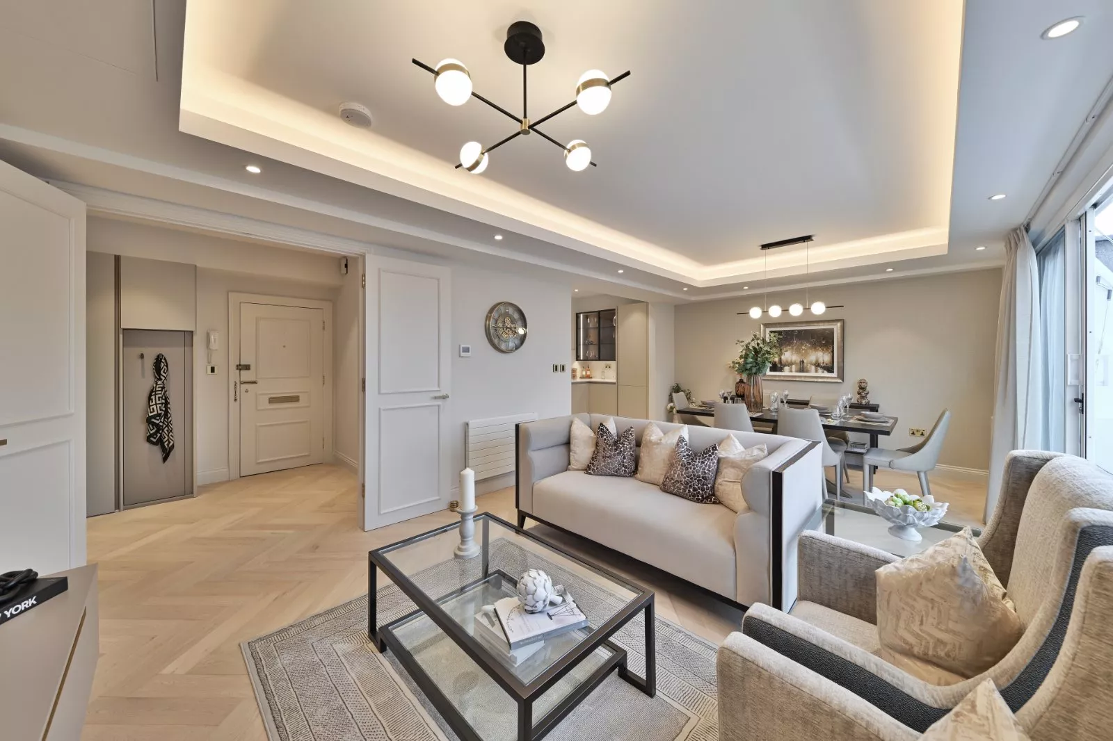 The property extends to 1052 sq. ft and comprises of two double bedrooms, both ensuite and with built in bespoke wardrobes. The moder fitted kitchen boasts high end appliances, woodwork and stone, whilst the double reception has elegant floor to ceiling glass which leads to aa large private terrace. The is also a separate WC.