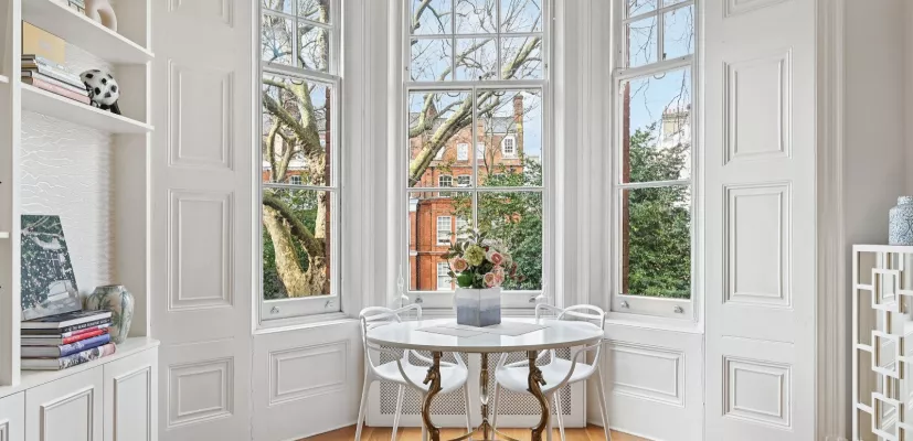 The accomodation is well balanced and thoughtfully arranged. The generous reception and dining room provide an impressive entertaining space with 3.49 metre ceiling height. Both the well-appointed kitchen and reception feature large windows which overlook the beautiful communal gardens, enhancing the sense of light and space. The double bedroom at the front provides 3.56 metre ceiling height, a remarkable feature rarely found in a home of this scale. Off the hallway sits a bathroom, a separate W/C with basin and a useful utility cupboard, offering practicality alongside the flat's period elegance.