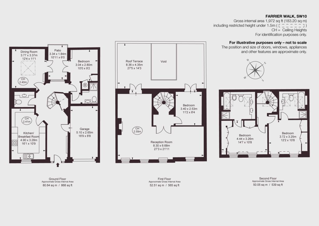 This lovely four bedroom house extends to 1,972 square feet and unusually has a significant first floor terrace as well as patio on the ground floor. Upon entering the property on the ground floor, there is a spacious entrance hall leading to a family kitchen, a lovely dining room, and a guest bedroom suite, both of which enjoy direct access to a patio. There is also a cloakroom on this floor. The first floor has a fantastic L-shaped reception room, providing an excellent light to pour in, as well as the access to a larger than usual roof terrace. This floor also hosts and addition bedroom with direct access to the terrace. Two bedroom suites are occupying the top floor offering a well-balanced family living.