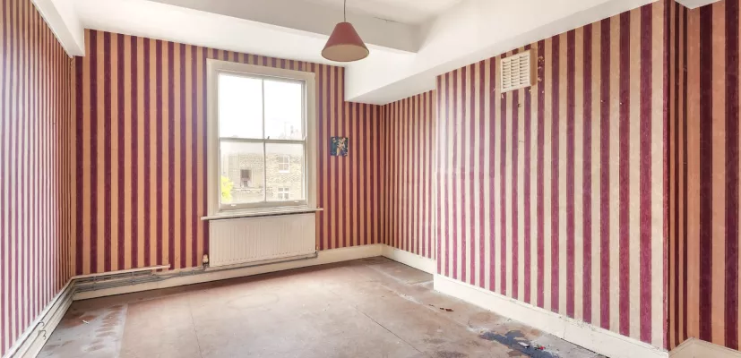 Entered on the first floor, the property currently comprises a spacious and light-filled reception room, a separate kitchen, a generous double bedroom and a bathroom. The well-proportioned layout offers clear scope for reconfiguration and enhancement, subject to the necessary consents, allowing an incoming purchaser to maximise space, light and overall value.