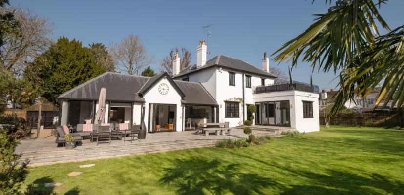 The hub of the house is the comprehensively fitted open-plan kitchen/breakfast room featuring sleek Poggenpohl cabinetry, a central island, and high-end Gaggenau appliances. A wall of bi-folding doors open out to combine indoor and outdoor living areas, a feature that is echoed in the drawing room and family; sliding glass pocket doors connect this room to the family room, thereby offering a versatile, open-concept layout. For large-scale entertaining, the capacious drawing room is equipped with a projector and drop-down cinema, while the sitting room provides a more intimate setting and could be utilised as a study. The ground floor further comprises a formal dining room, a guest bedroom with en suite shower room, a utility room, and a cloakroom.