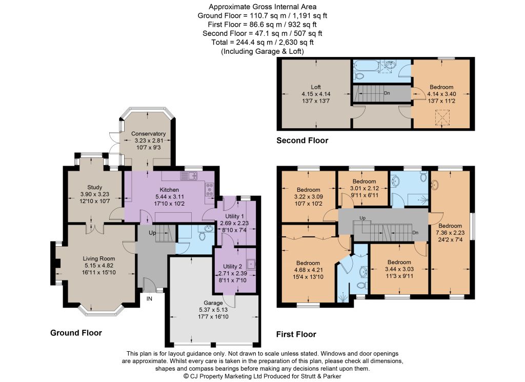 A light and spacious hallway with the added benefit of cloakroom, leads to three reception rooms that provide versatile space for relaxaton and entertainment. The living room features a bay fronted window and French doors leading to the study / dining room There is also a large recessed fireplace with a woodburning stove creating a cosy focal point. The well-apointed kitchen, with its integrated appliances, connects to a large utility room and provides access to the outside. There is a second utility room with a sink and mega flow system and access to the integral garage. Open to the kitchen is a fabulous conservatory providing a perfect space to entertain and offering views onto the well maintained garden.