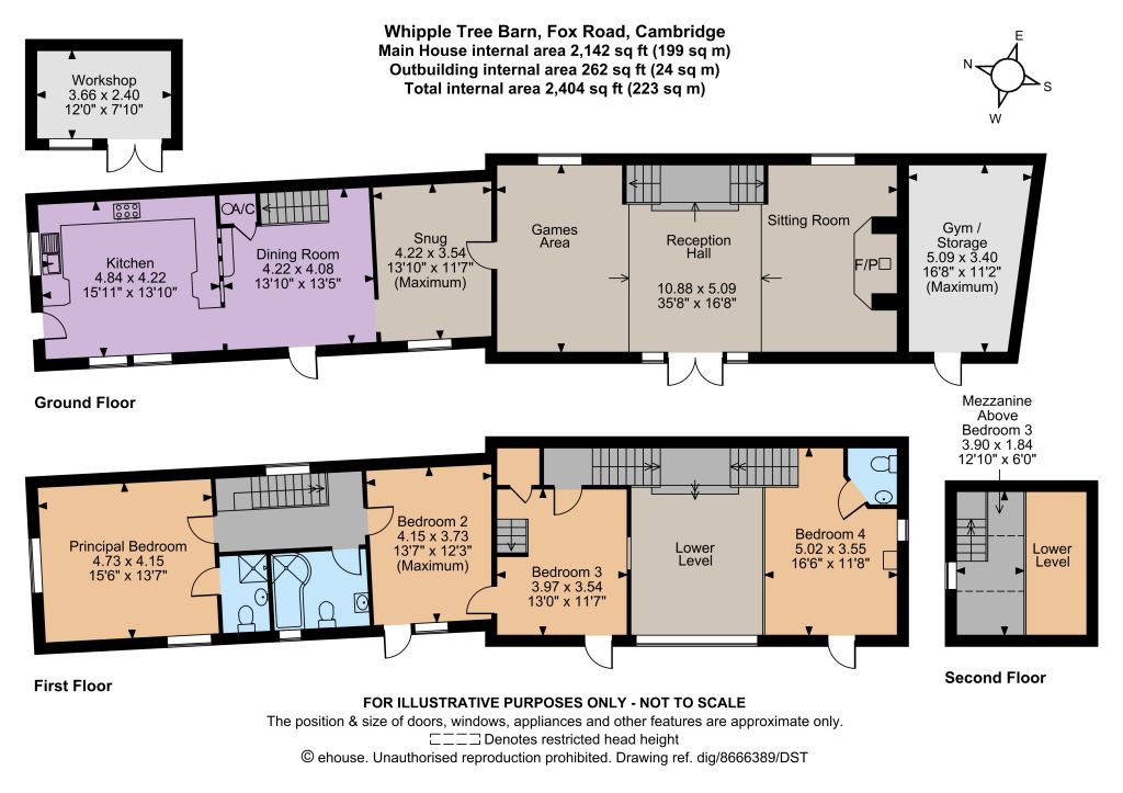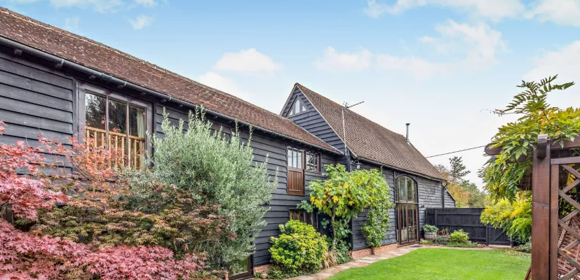 Whipple Tree Barn is a Grade II Listed, weather boarded barn conversion offering 2,404 sq ft of light-filled accommodation arranged predominantly over two floors. Configured to provide a characterful and practical family and entertaining environment, it sensitively combines exposed wall and ceiling beams with quality fixtures and fittings including contemporary sanitaryware and elegant décor throughout. The accommodation flows from glazed double doors opening into a vaulted double-height reception hall with full-height glazing, flagstone flooring and a feature imperial staircase with galleried landing over. Extending to almost 36ft, the hall opens on one side to a sunken sitting room with an exposed brick fireplace with woodburner. To the left hand side is a flexible space currently used as a games area with a pool table, but equally could be used as an additional dining area. A door from the family room gives access to a front aspect snug. It opens to a kitchen and dining room with flagstone flooring throughout. The dual aspect kitchen has a range of bespoke wooden wall and base units, complementary worktops and splashbacks, a Belfast sink, modern integrated appliances and a stable door to the garden. An open-timbered wall separates it from a dining room, garden access and a further staircase to the first floor. There is a wet underfloor heating system throughout the downstairs. The vaulted first floor accommodation is in two inter-connecting parts. The main staircase rises on one side to a galleried landing providing an open-sided bedroom with en suite cloakroom, currently a spectacular home office. The other side offers a double-height second bedroom with internal glazing overlooking the hall below, storage and steps rising to a mezzanine over which can be used as storage or a childrens play area. A second staircase rises from the dining room and gives access to the property’s two remaining double bedrooms and a family bathroom. The principal bedroom has a double height ceiling, large panoramic windows, exposed beams and an en suite shower room The second double bedroom also boasts high ceilings and exposed beams, with the added benefit of alternative access to bedroom 3 providing a flexible living space depending on your requirements.