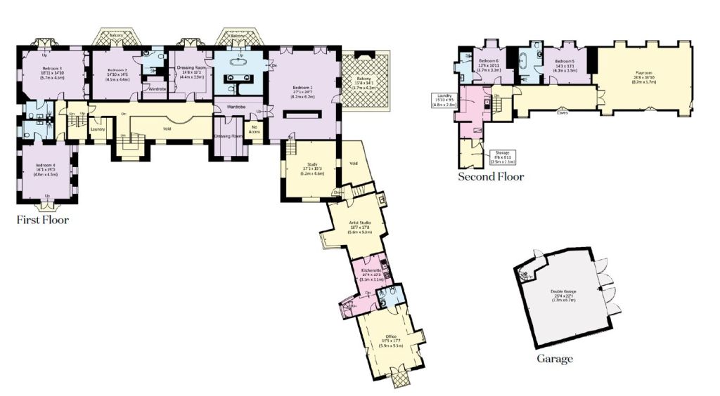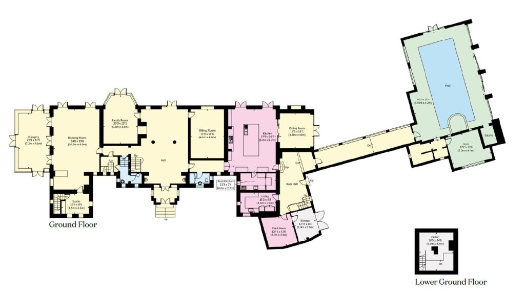 There are six main reception rooms including a spectacular entrance hall. The drawing room, orangery and open plan kitchen are particularly fine. On the first floor is a large main bedroom suite with ensuite bathroom, two dressing rooms, and a private balcony, with three further bedroom suites arranged off the landing. Two further bedroom suites and a play room are on the top floor. A wing provides a study, artist’s studio, kitchen and office, equally suitable as a housekeeper’s annexe. A link leads through to an indoor pool complex with gymnasium in the process of being completed.