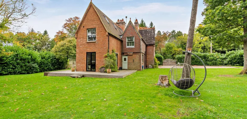 East Lodge is an attractive part tile-hung period family home, sensitively extended to offer more than 2,400 sq ft of light-filled, flexible accommodation arranged over three floors. Configured to provide an elegant and practical living and entertaining environment maximising the views over the garden and woodland beyond, the accommodation flows from a welcoming part-panelled entrance hall with wooden flooring. It opens into a wooden-floored family room with a fireplace, opening in turn to an inner hall. It has a useful cloakroom and gives access to a dual aspect sitting room with painted wooden flooring and a fireplace with woodburning stove flanked on each side by bespoke shelving, a through boot room with terrace access and a large wooden-floored kitchen/family room. The kitchen has a range of bespoke wall and base units, a large zinc-topped central island with a breakfast bar and wine chiller, complementary work surfaces, tiled splashbacks, a Rayburn cast iron stove and modern integrated appliances. It opens on one side into a family area with full-height glazing and French doors to a garden terrace and on the other to a triple aspect orangery-style conservatory/dining room with a vaulted glazed roof, patterned tiled flooring and feature picture glazing incorporating French doors to a garden terrace.