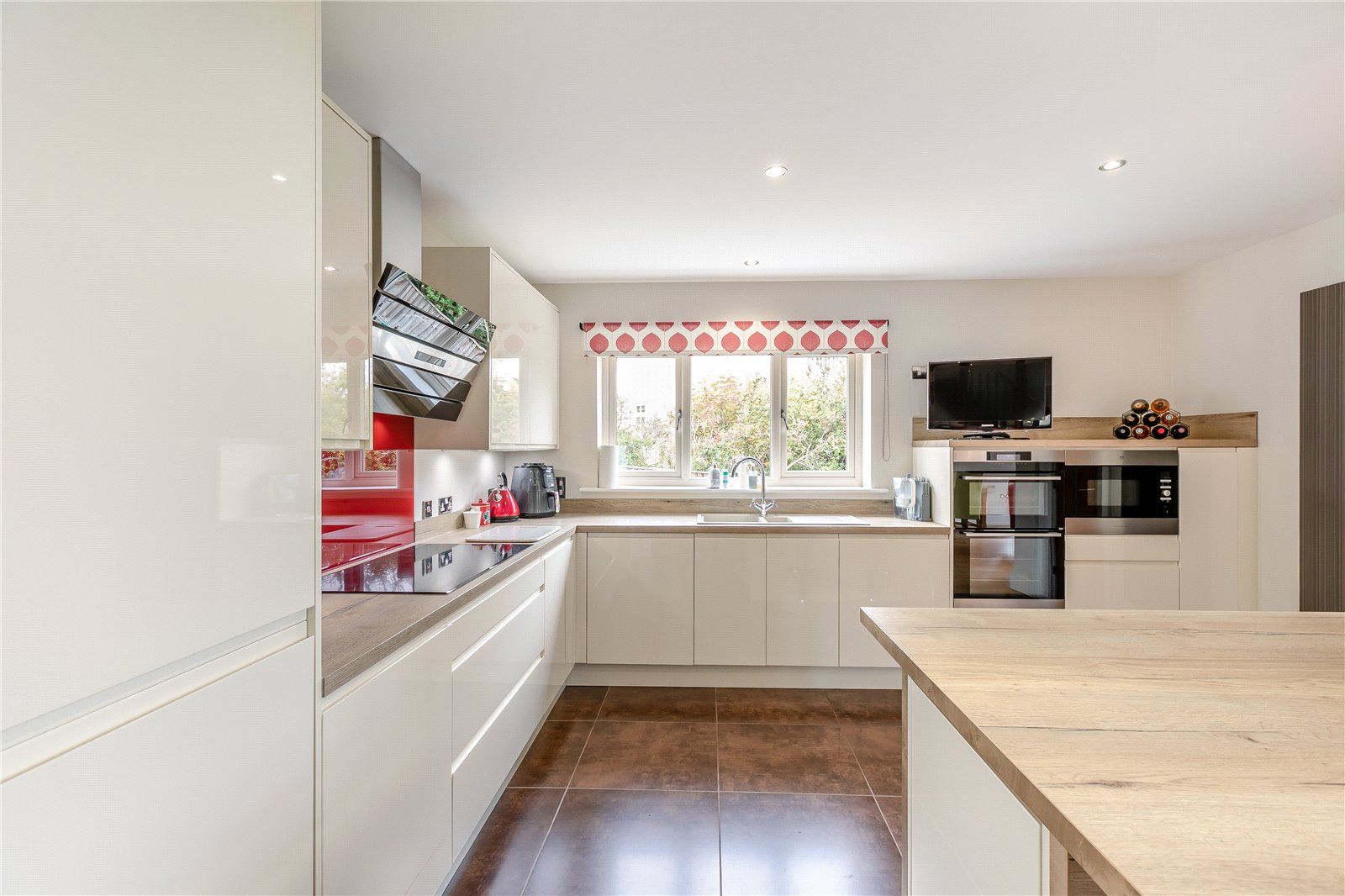 The ground floor accommodation is completed by an extensive open plan kitchen/sitting/dining room. The kitchen has tiled flooring, a range of contemporary high-gloss wall and base units, an island with breakfast bar, complementary work surfaces and splashbacks, modern integrated appliances and a door to a fitted utility room with access to steps down to driveway and rear garden. The remaining space, configurable to the purchasers’ own requirements and featuring a vaulted double-height ceiling and wooden flooring throughout, has a dining area with space for a sizeable table and a sitting area with feature double height glazing and two sets of French doors, one to the balcony and the other to the steps descending to the driveway.