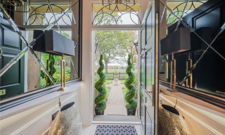 Set behind modern iron railings and an area of lawn and having plenty of kerb appeal, the property is approached through a contemporary iron gate over a block-paved driveway providing private parking and leading past the house to the detached double garage to the rear