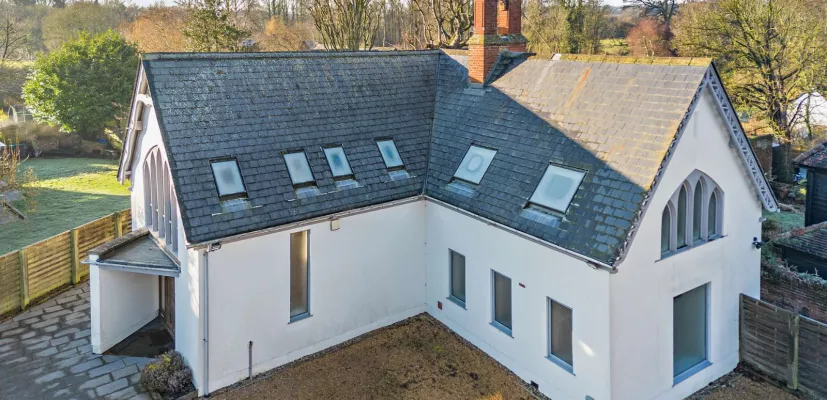The property The Old School is a splendid former village school building, which has been lovingly transformed into a magnificent contemporary home with five bedrooms, four reception rooms and spacious accommodation in which to relax and entertain. The property retains several external character details, such as its arched windows and original chimney stack, while inside the décor is chic and modern, with striking bespoke fittings and a stylish look and feel throughout. Entering the property, the impressive main hallway has a glass roof and leads to the 27ft sitting room towards the rear, with its full-height windows, exposed steel beams and fireplace fitted with a log burner. The social kitchen and dining room is the heart of the home and is another large open-plan living space. The kitchen itself is fitted with sleek, dual tone kitchen units and features integrated appliances by Miele, including four ovens and an induction hob with an extractor overhead, while the dining area has space for a large family dining table. There are an additional two ground-floor reception rooms, which could be used as a study and a snug, or could also be converted into a bedroom if required. Four bedrooms can be found on the first floor, accessed via the turned staircase, which has a built-in slide, lending a sense of fun and mischief to the home. The four first-floor bedrooms include the luxury principal bedroom, which features a vaulted ceiling and various original details, including exposed timber eaves. The principal bedroom also has a dressing area and ensuite bathroom, which has a large bathtub and dual washbasins, while there is also a family bathroom and an additional shower room on the first floor. Separate stairs lead to a further bedroom with an ensuite bathroom.