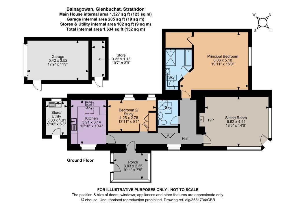 Floorplans Main House internal area 1,327 sq ft (123 sq m) Garage internal area 205 sq ft (19 sq m) Stores & Utility internal area 102 sq ft (9 sq m) Total internal area 1,634 sq ft (152 sq m) For identification purposes only. General Local Authority: Aberdeernshire Council