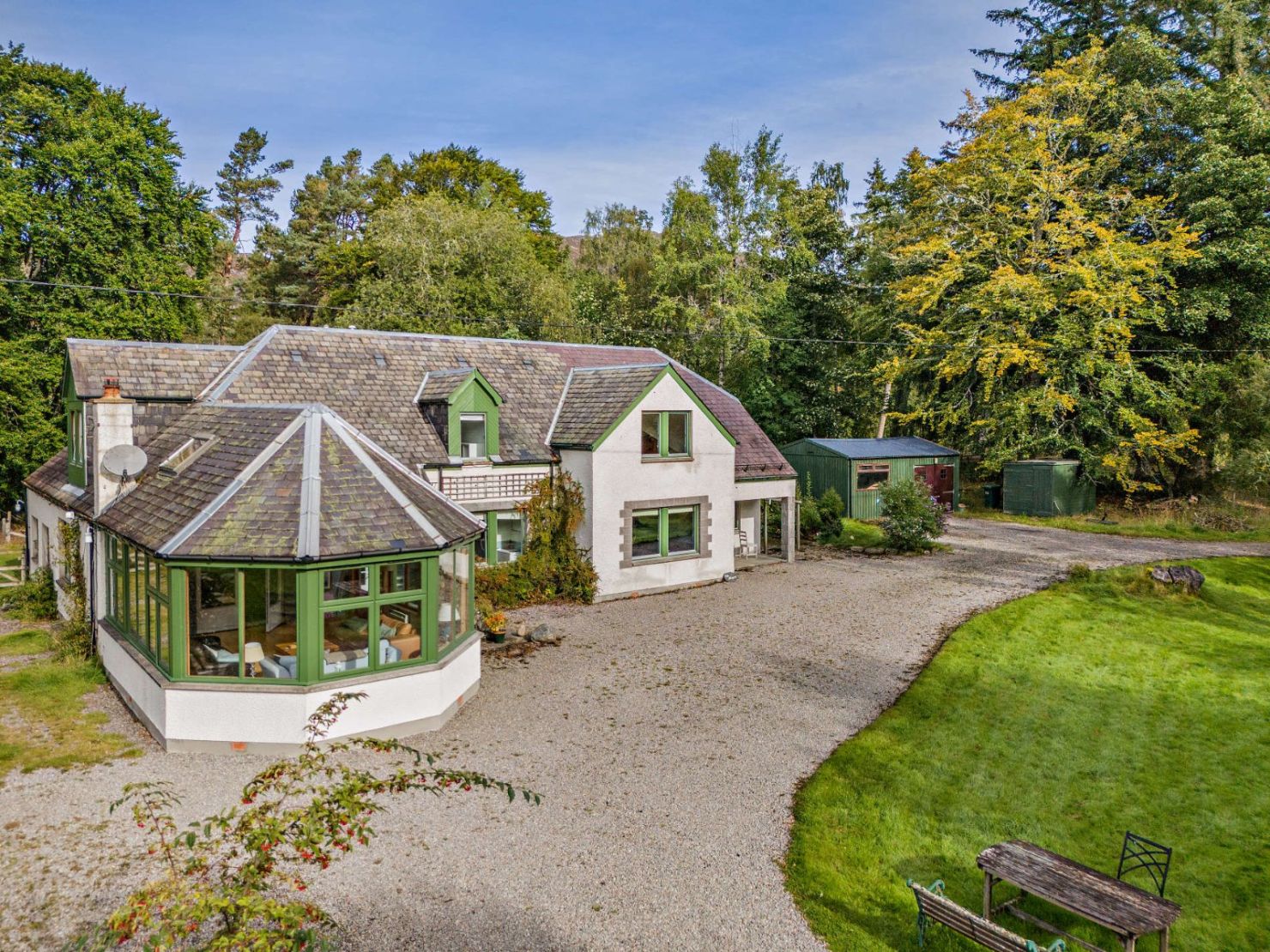The house is approached via a track which leads to a gravel driveway at the front of the house, providing plenty of parking space for residents and guests alike. The surrounding woodland provides a sense of seclusion. There are low maintenance lawns on three sides of the house, a herbaceous border, and a deer fenced vegetable garden currently used for chickens. There is ample opportunity for a keen gardener. In addition, there is a large outbuilding with electricity, for use as a garage and workshop; plus a garden shed.