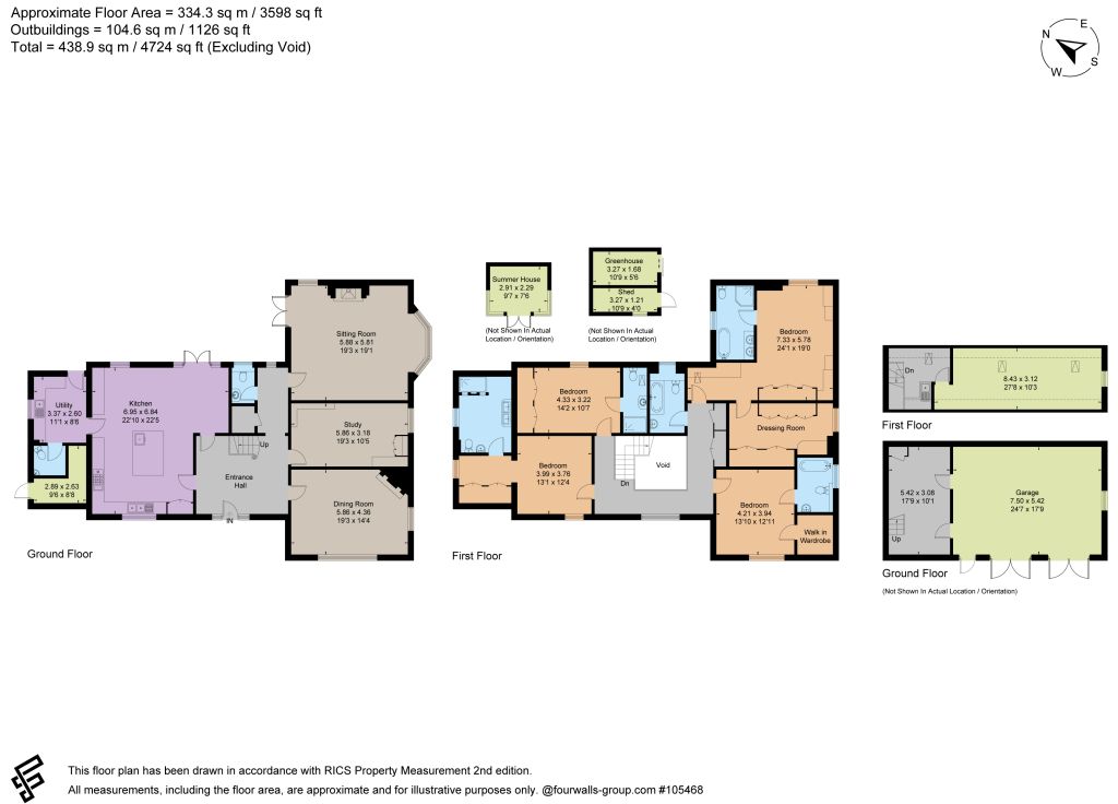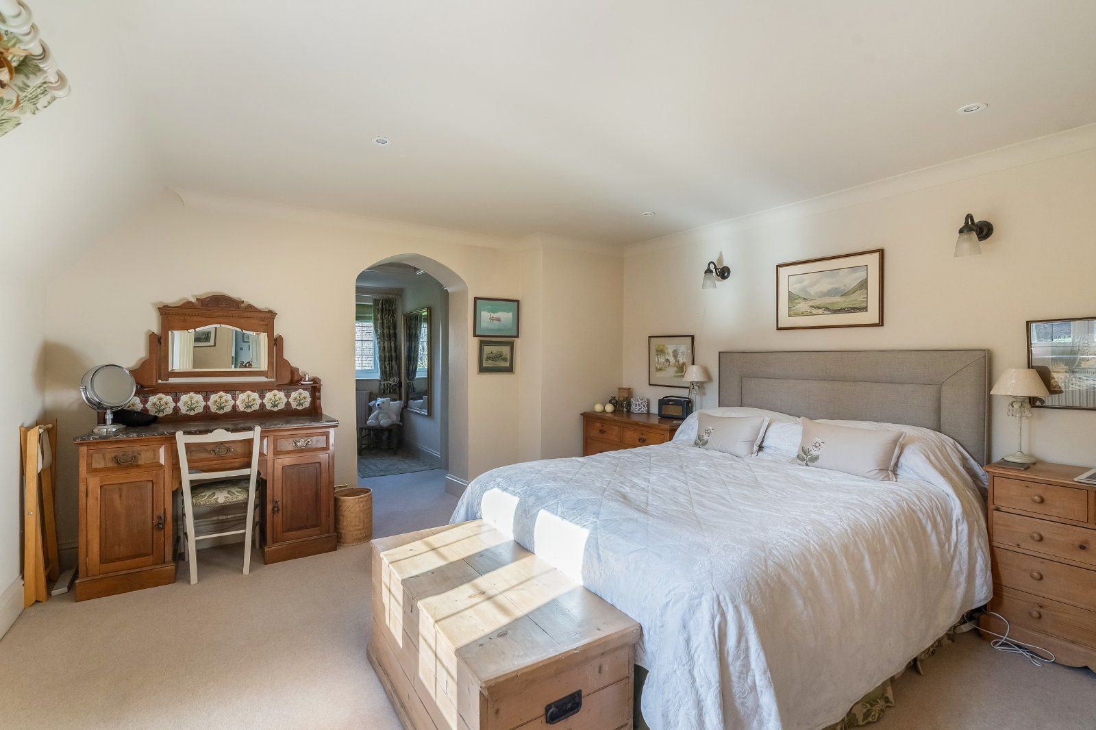 The first floor continues to provide generous and adaptable accommodation. The principal bedroom suite benefits from its own en suite bathroom and an adjoining dressing room. This dressing room was previously configured as a fifth bedroom and could readily be reinstated if required, offering flexibility depending on a purchaser’s needs.