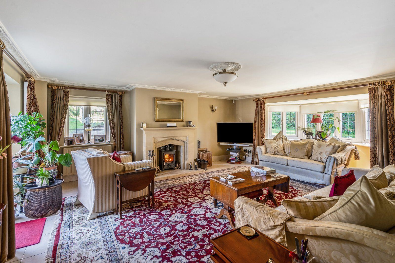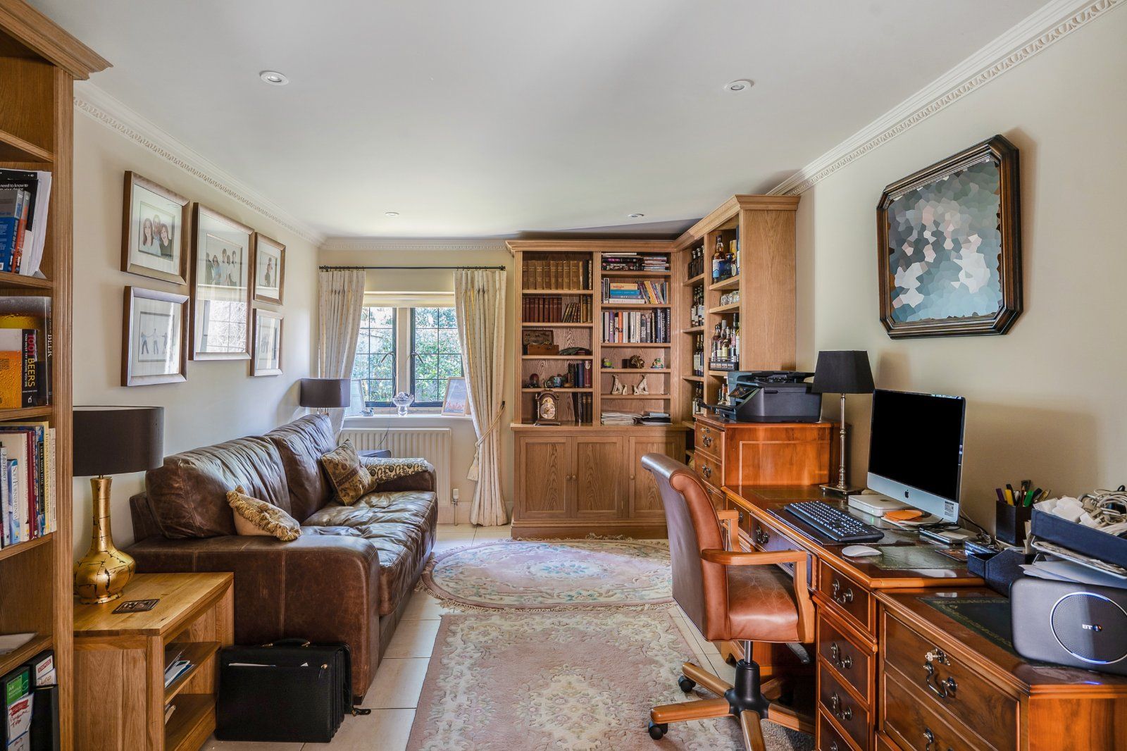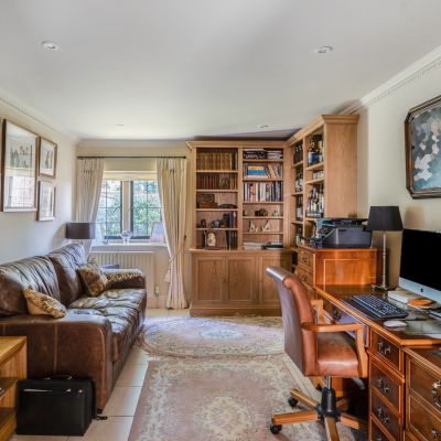 The principal sitting room is a generously proportioned space, ideal for relaxation and family gatherings, while a separate dining room provides an elegant setting for entertaining. A dedicated study offers a quiet and functional workspace, well suited to those working from home or requiring a private office.