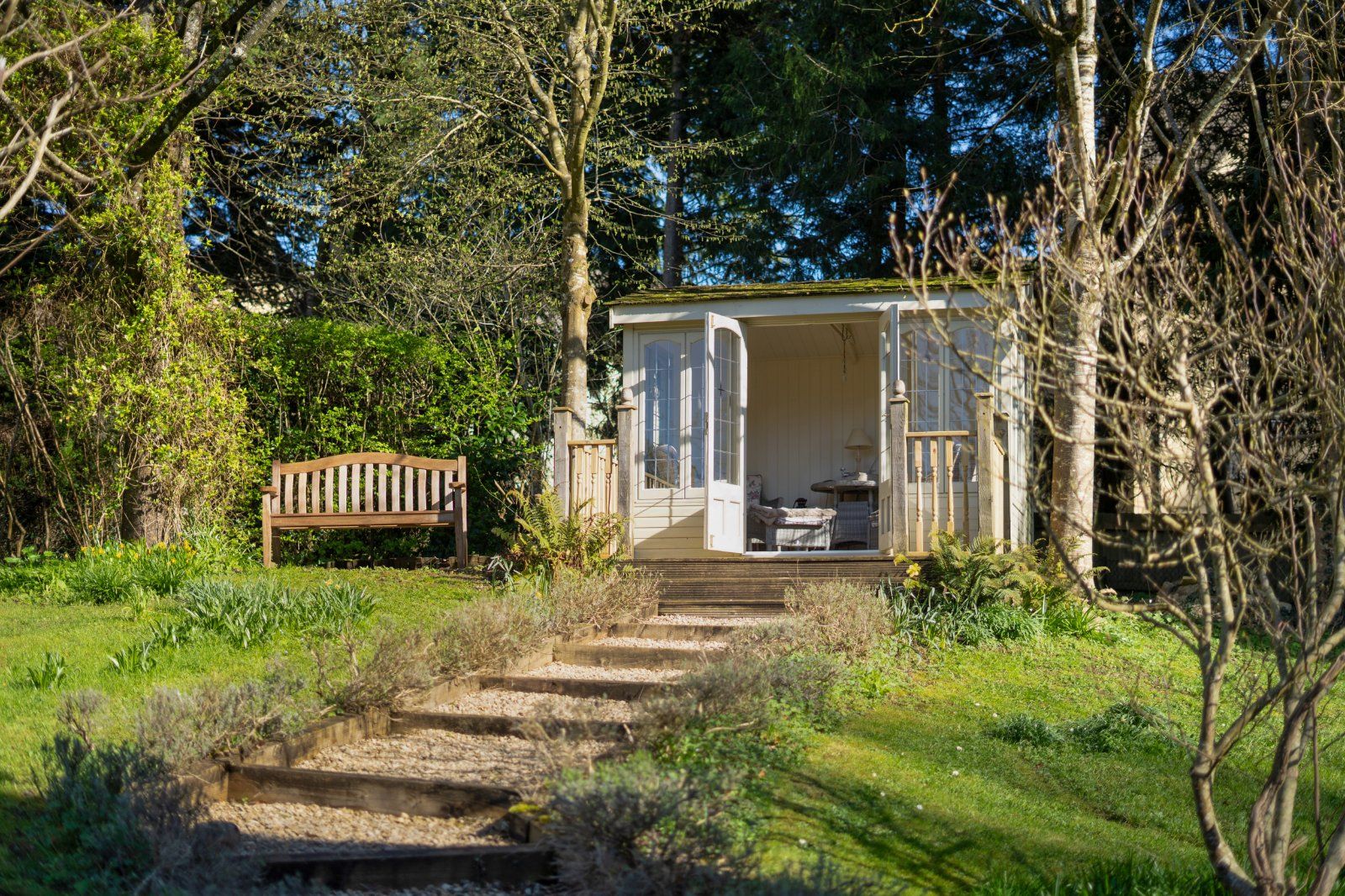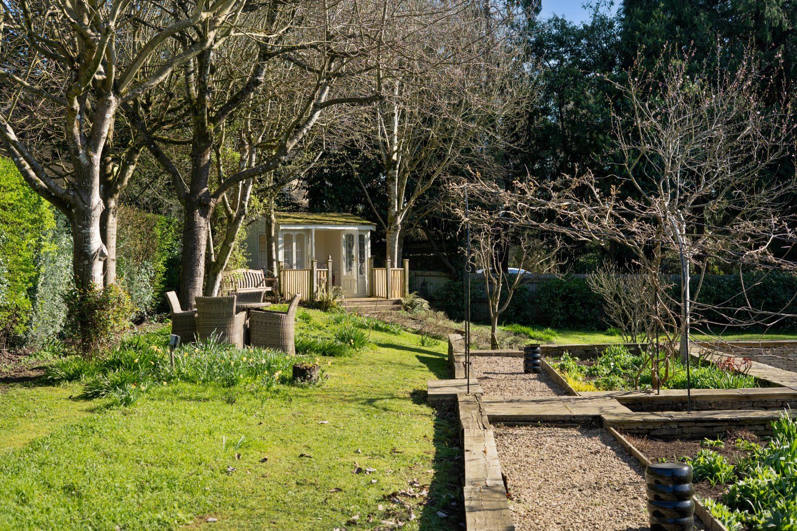 To the rear and sides of the house, the gardens offer a variety of usable outdoor spaces, ideal for relaxation, recreation and entertaining. Areas of lawn provide ample room for family activities, while carefully designed seating areas and planting schemes create sheltered spaces for outdoor enjoyment.