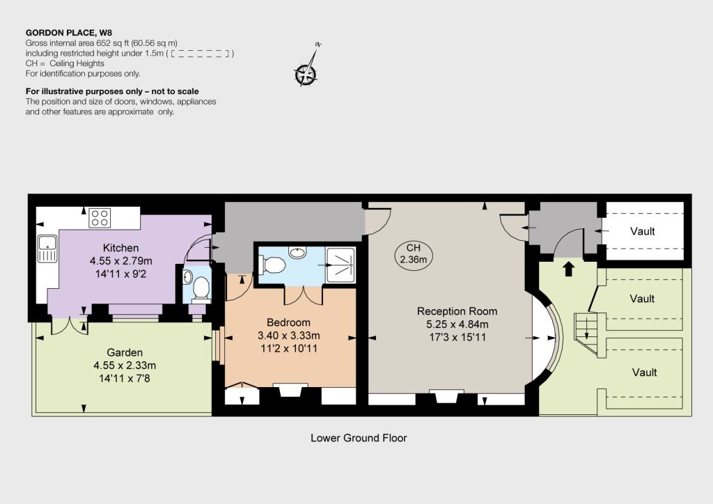 This charming one bedroom flat is neutrally decorated throughout with wood flooring in the drawing room and kitchen. The generous reception space has built in shelving and cupboards, fireplace and attractive window seat. The kitchen is modern and bright, with space for a breakfast table, and has access onto the private paved garden. The bedroom boasts fitted wardrobes, shelving and a smart en suite shower room. Further still there is a guest cloakroom and excellent vault storage.