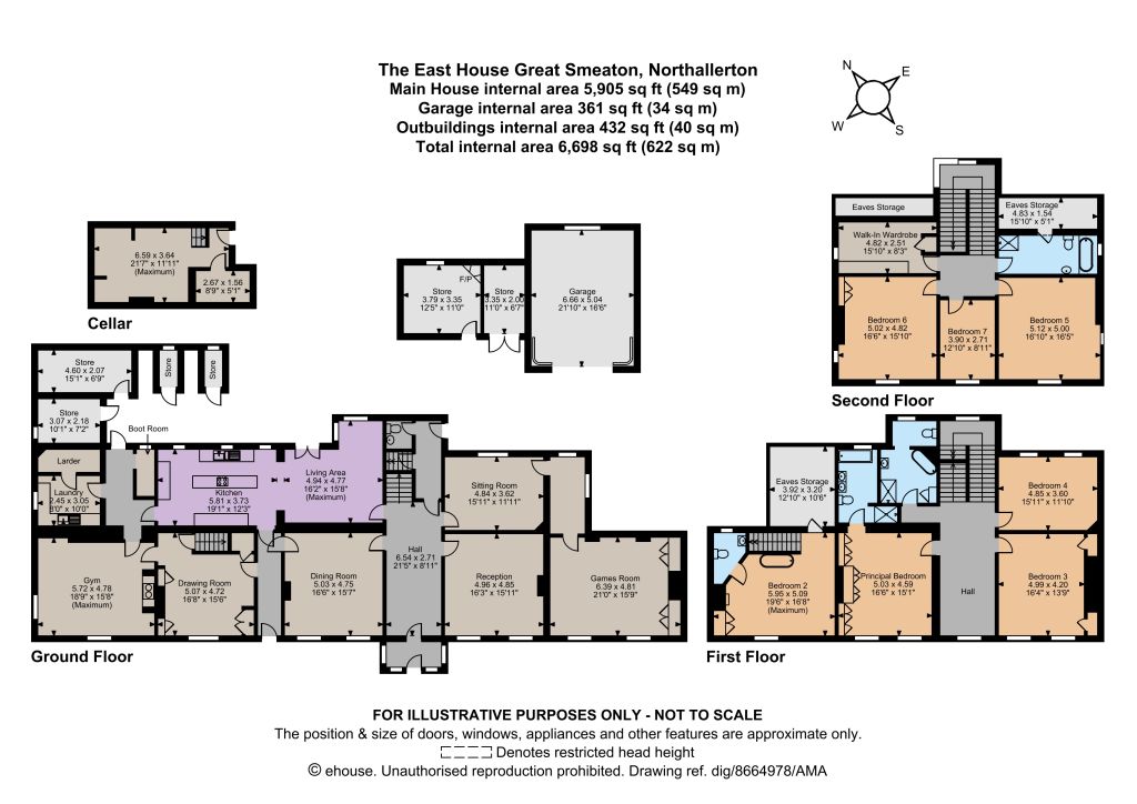 The accommodation flows from a reception hall, with original flooring and gives access to the rear garden and a useful cloakroom. It briefly comprises reception and dining rooms, both with fireplaces, together with a sitting room with an adjacent inner hall and a games room with a fireplace flanked by bespoke storage. The kitchen/living room has a freestanding woodburning stove and French doors to the terrace and rear garden. The modern kitchen has a range of bespoke wall and base units, a large central island with breakfast bar and modern integrated Smeg appliances, including a dishwasher, Smeg induction hob, two built-in ovens and microwave combi oven. A door from the kitchen opens to a rear hall with a boot room, laundry with space for a two washer/dryers and inter-connecting larder. It gives access to a gym and a neighbouring drawing room with fireplace and access to a separate side entrance hall linking to the dining room and kitchen. Stairs from the drawing room lead up to a vaulted bedroom with freestanding bath, walk-in eaves storage and an en suite cloakroom, together with the gym and drawing room below offering potential for use as a self-contained annexe. Stairs rise from the reception hall to the two upper floors. The first floor provides three double bedrooms, the principal having extensive bespoke fitted wardrobes and an en suite bathroom with twin sinks, together with a family bathroom. The property’s three remaining double bedrooms, a further family bathroom and a walk-in wardrobe can be found on the second floor. The property also benefits from generous cellarage.