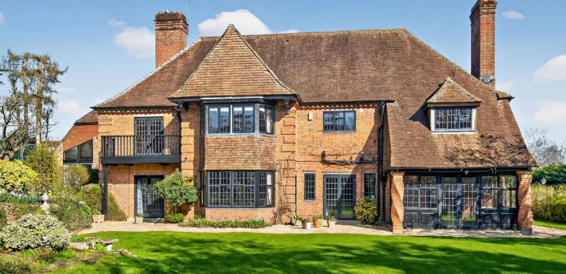 This handsome brick-built property was designed in 1926 by the Oxford architect Thomas Rayson in the Arts & Crafts tradition. It offers more than 5,000 sq. ft. of versatile accommodation. Original features include a butler's pantry, distinctive fireplaces and narrow strip oak floorboards. The main entrance is via a large, brick columned storm porch, through a smart vestibule and then into a wide entrance hallway with double doors and a fireplace. The impressive drawing room measures over 350 sq ft with high wooden beams and a striking feature fireplace with a log burner. Double doors enter into the garden room with wooden panelling. The spacious dining room has a bay window and corner fireplace. Off the dining room is a further reception room currently utilised as a study with French doors to the garden. The kitchen is bright with modern painted units and wooden worktops, with a recessed Lacanche range cooker, complete with a sleek extractor and glass splashback, in addition to a separate gas hob and oven. There is plenty of space for a dining table and chairs. Finally, the butler’s pantry features original shelved cabinetry for crockery and a sink. Along a back corridor are two spacious storerooms, a secondary, everyday entrance to the house, a toilet and a laundry/ utility room. The original wide staircase with a tall landing window goes up to the 1st floor which contains five, good-sized, double bedrooms, of which four have en-suite bathrooms. The fifth is served by a family bathroom, directly opposite. The principal bedroom has a wide bay window with commanding views over the gardens and bedroom four has access to a pretty balcony. The upstairs landing leads around to an extended part of the house where there is a changing room with shower and toilet for the indoor swimming pool, which is accessed via a flexible space which is currently used as a gym, overlooking the pool. A few steps lead down from this room past a hot tub to the indoor pool area. Sliding doors from the pool lead out to the garden and an inviting south-westerly facing paved terrace.