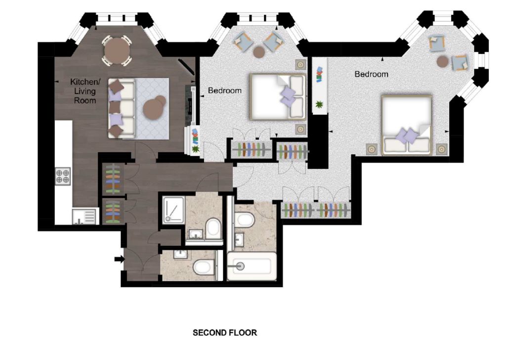 The apartment comprises open plan kitchen reception room, cloakroom, two double bedrooms, shower room, en suite bathroom.