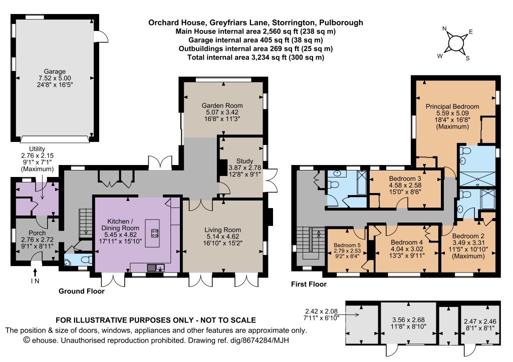Set behind mature hedging and occupying an elevated plot, the property is approached over a side driveway providing private parking and giving access to the detached double garage with an internal door to the rear garden. The well-maintained wraparound garden surrounding the property is laid mainly to lawn bordered by mature shrubs and hedging. It features a large paved front aspect terrace accessible from the living and kitchen/dining rooms and a generous split-level paved rear terrace accessible from the reception hall and garden room. The whole is ideal for entertaining and al fresco dining and enjoys far-reaching view over surrounding countryside. The property also benefits from a 269 sq ft range of wooden open-sided and enclosed outbuildings, suitable for a variety of uses.