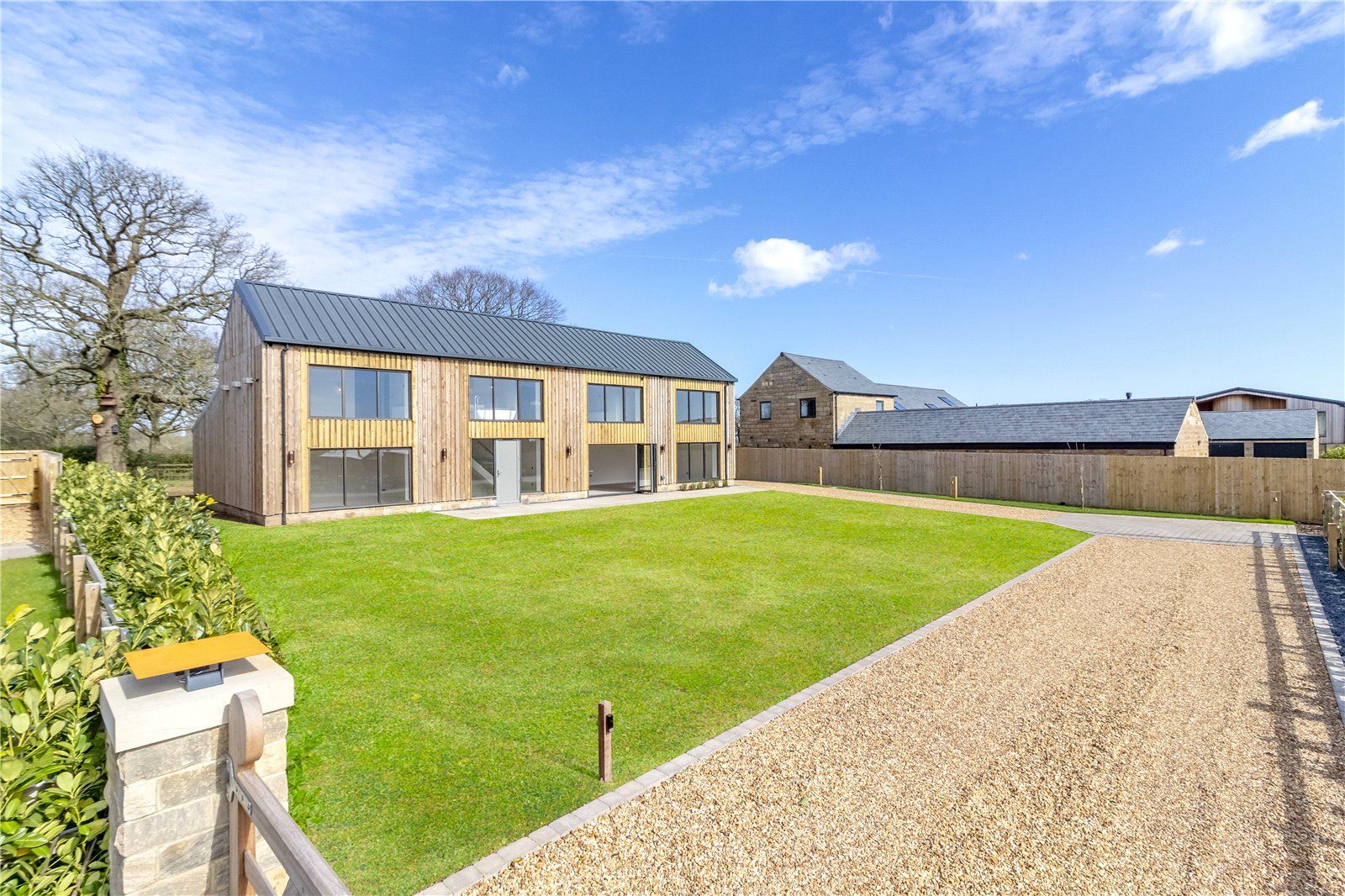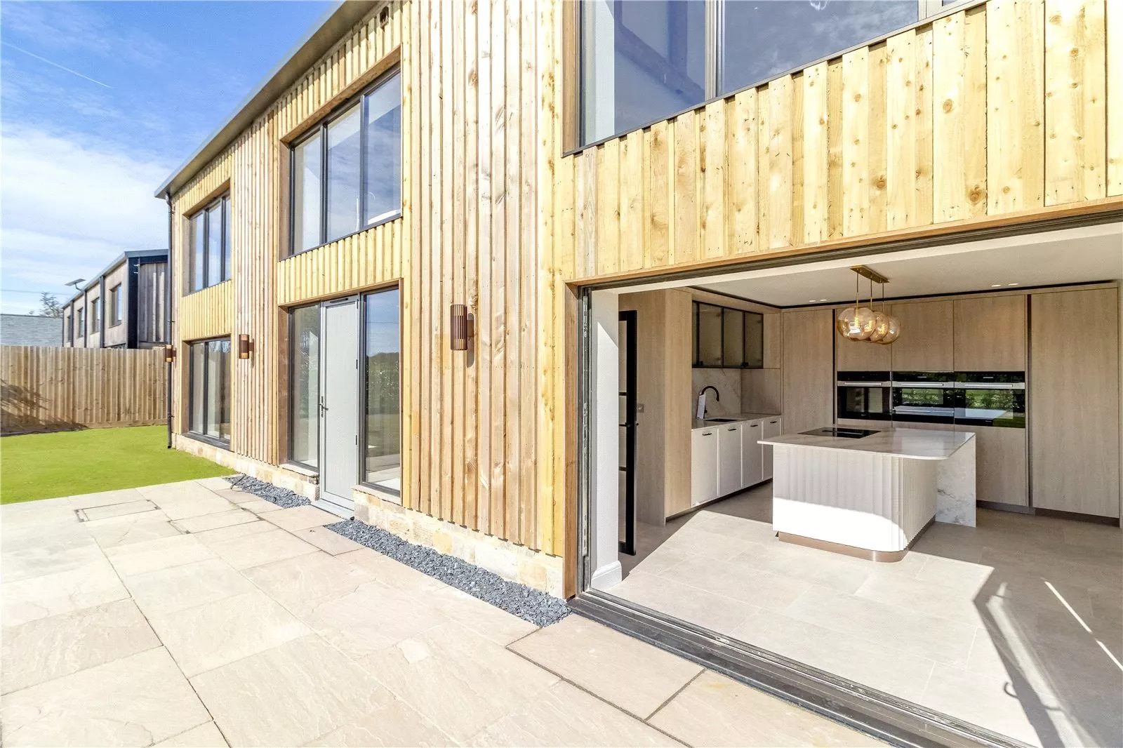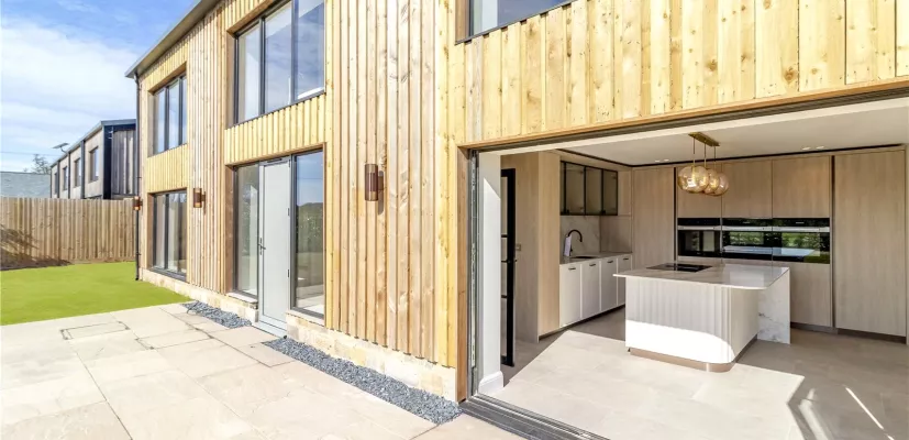 The property features striking Therma wood panelling beneath a sleek pitched roof, creating a stylish yet sympathetic addition to its countryside surroundings. Expansive glazing across both floors allows for an abundance of natural light, while also making the most of the delightful outlook over the gardens and open countryside beyond.