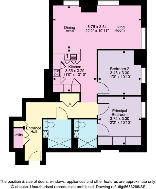 The layout includes a large open plan reception/dining/kitchen, two double bedrooms, two bathrooms, and a welcoming entrance hall with useful storage. The living areas have attractive hard-wearing engineered wood flooring. The principal bedroom features fitted wardrobes and an en suite with highquality porcelain tiling and underfloor heating. The second bedroom is served by a family bathroom that also functions as a guest cloakroom.