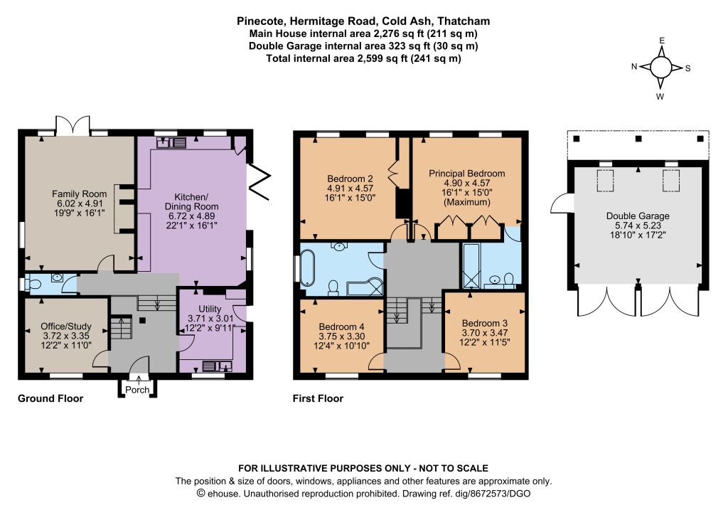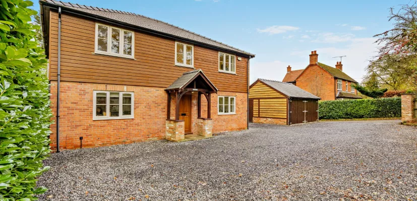 Pinecote is beautifully presented four-bedroom family home, featuring part-clad and red brick elevations and set in a well-maintained garden. Situated in the heart of the desirable village of Cold Ash, the property features light and spacious living accommodation with neutral and understated styling, as well as a combination of modern fittings and character details. On the ground floor, a welcoming split-level hallway leads to a useful office and a utility room with fitted storage and space for appliances. Steps open into the rear-aspect, open-plan kitchen and dining room. This well-proportioned living and entertaining room has wooden flooring, space for a dining table and a seating area, exposed brick feature-wall and bi-fold doors opening to the garden. The kitchen itself has extensive fitted units and wooden worktops, and space for a range cooker. Additionally on the ground floor there is a generous sitting room with fireplace and woodburning stove, along with French doors opening to the garden. Upstairs there are four well-presented double bedrooms, including the principal bedrooms with built-in wardrobes, dormer windows overlooking the rear garden, and en-suite bathroom with walk-in shower. One further bedroom benefits from fitted storage. The first floor also has a family bathroom with a stylish suite, featuring a freestanding roll top bath and separate shower.