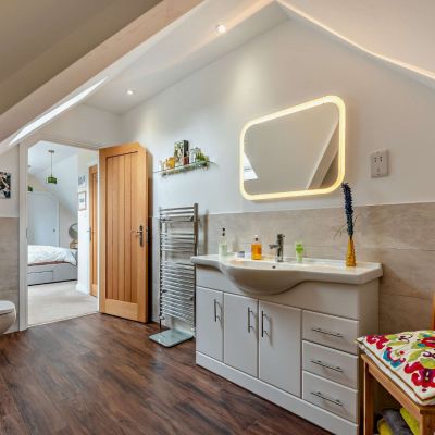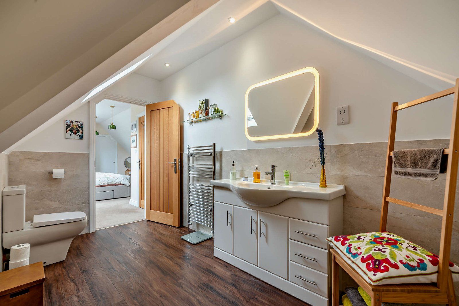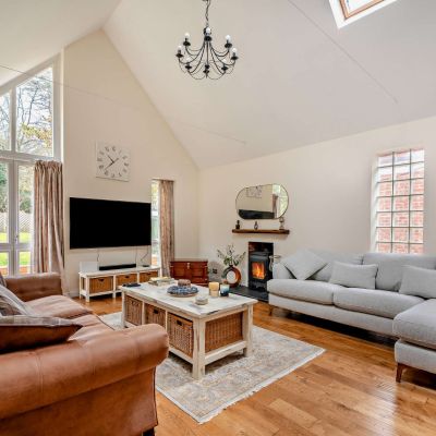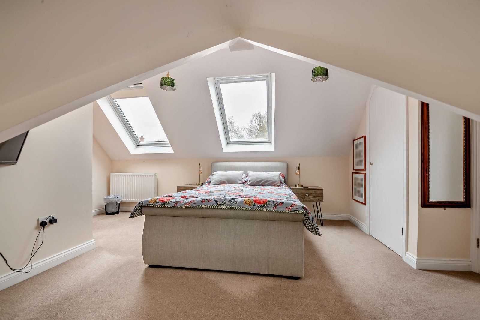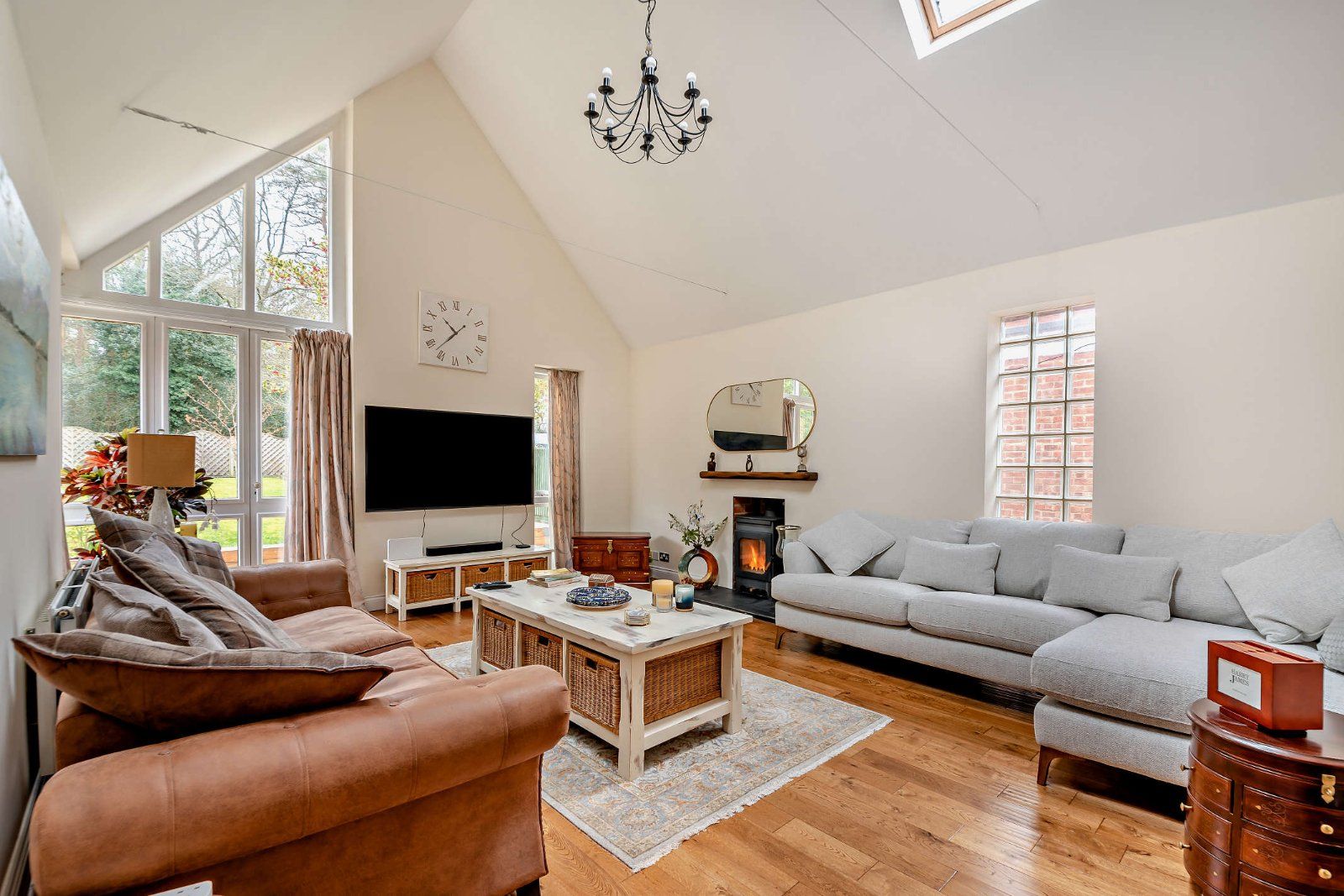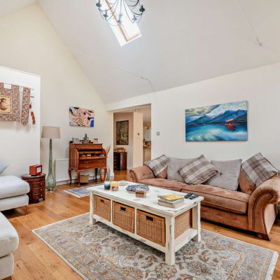 The kitchen has shaker-style fitted units, wooden worktops and space for a range cooker, as well as space for a family dining table. At the heart of the home lies a striking sitting room, enhanced by a vaulted ceiling, skylights and a dramatic gable-end window that floods the space with natural light. Wooden flooring and a log burner create warmth and sophistication, while the seamless connection to the reception hall and kitchen/dining area provides a wonderful sense of continuity.
