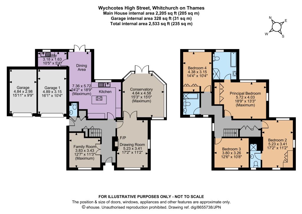 Wychcotes is an impressive detached family home with four bedrooms, set in a convenient and soughtafter position in the small village of Whitchurch on Thames. The property features attractive cobbled and red brick elevations to the front and rendered elevations to the rear, while inside there are three well-presented reception rooms with neutral décor and plenty of natural light. These include the dual aspect drawing room at the front of the house, which has a fireplace fitted with a woodburning stove and south and west-facing windows to the side and front respectively. Double doors lead from the drawing room to the sunny conservatory, which has a glass roof fitted with a ceiling fan and features French doors opening onto the rear gardens. On the ground floor there is also a comfortable family room in which to relax, while at the rear there is an open-plan kitchen and dining area with space for a family dining table and French doors opening onto the rear gardens. The kitchen itself has fitted units to base and wall level, a central island and integrated appliances, including a double oven, a gas hob and an overhead extractor fan. Adjoining the kitchen, the utility room provides further space for appliances and home storage. Upstairs you will find four well-presented double bedrooms, two of which are en suite. These include the generous principal bedroom with its built-in wardrobes and en suite bathroom, which has a bathtub and a separate shower unit. The second bedroom also has fitted storage, plus an en suite shower room, while the first floor landing also provides access to the family bathroom, which has an over-bath shower.