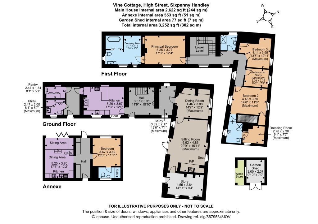 At the front of the property, the in/out gravel driveway provides plenty of parking space for several vehicles, while at the side, gates provide access to the rear garden, where there is an additional parking space if required. The courtyard garden at the rear includes paved and gravel terracing, with sheltered space for al fresco dining, raised beds with lavender and various established shrubs. Beyond the courtyard and the annexe there is a further patio for use by the annexe occupants, and a generous expanse of south-facing lawn, with a timber shed and wood store at the end of the garden. There are a range of fruit trees including apple, pear and plum.