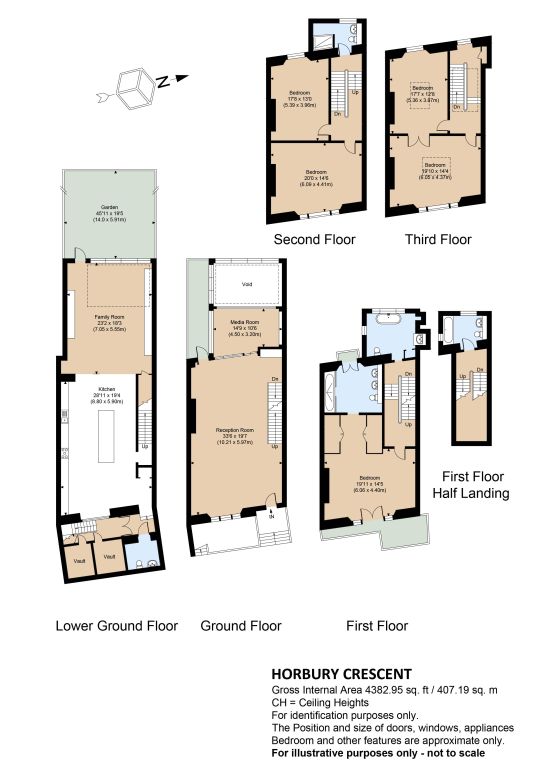 The highlight of the home is the principal suite, which occupies the entire first floor, featuring a spacious bedroom, a luxurious en-suite bathroom, and ample fitted storage. The upper floors offer four further double bedrooms, served by two well-appointed bathrooms, providing flexible accommodation for family and guests.