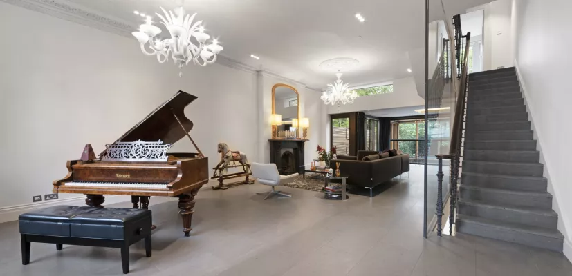 On the lower ground level, the open-plan kitchen, dining, and family room create an inviting space for everyday living. A striking double-height glass extension floods the area with natural light and seamlessly connects the interior to the landscaped garden, perfect for entertaining.