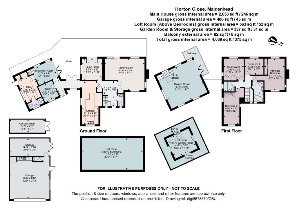 The first floor hosts a principal suite with an en-suite bath/shower room, a second en-suite bedroom, and two additional bedrooms served by a family bathroom.