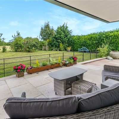 At the front of the house there is a block-paved driveway with parking for several vehicles and access to the detached garaging block, which has a well-designed utility room on its ground floor and a spacious games room upstairs which could be used as a large home office with an extra- large row of built in cupboards. The rear garden has beautiful split-level patios with outside lighting, a built-in fireplace and barbeque and lots of space for al fresco dining and entertaining. The private garden has easy to maintain cottage garden and laurel borders and beyond there is a large paddock laid to meadow with grasses and seasonal wildflowers which is approximately a three quarters of an acre and includes an orchard, small woodland and borders of established flowering and fruiting hedgerow.