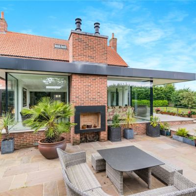 The main formal reception room is the 23ft drawing room, which has a triple aspect, parquet flooring and a grand brick-built fireplace with a timber lintel and a wood burning stove. A study, with parquet flooring, a built-in bookcase with cupboards and a window seating looking onto the garden. The heart of the home is the open plan living, dining and entertaining space at the rear. It includes underfloor heating, a wood burning stove full-height panoramic windows, skylights and sliding glass sky frame doors opening onto the patio area which has a Swedish style overhang for inside-outside living. The stylish kitchen by Peter Thomson of York has modern walnut state-of-the-art fitted units, beautiful marble worktops as well as integrated appliances by Wolf and Subzero, including a coffee maker, dual ovens, steam oven, an induction hob and a gas burner range.