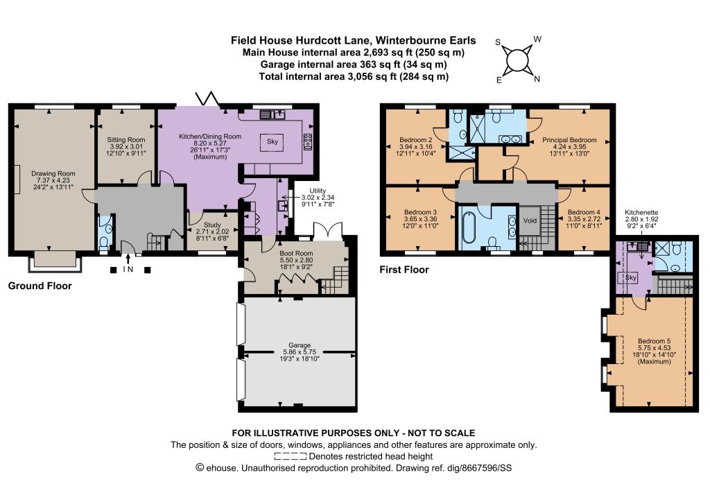 Upstairs, the accommodation is split into two discreet areas, accessed via separate staircases. The main first-floor area has a galleried landing, which leads to four double bedrooms, including the generous principal bedroom with its walk-in wardrobe and en suite shower room. One further bedroom is en suite, while there is also a family bathroom. The second upstairs area has a large double bedroom with dormer windows, as well as a kitchenette and a shower room. Accessed via the boot room, which has its own private entrance at the rear of the house, the space is ideal for use as an annexe for guests or family members.