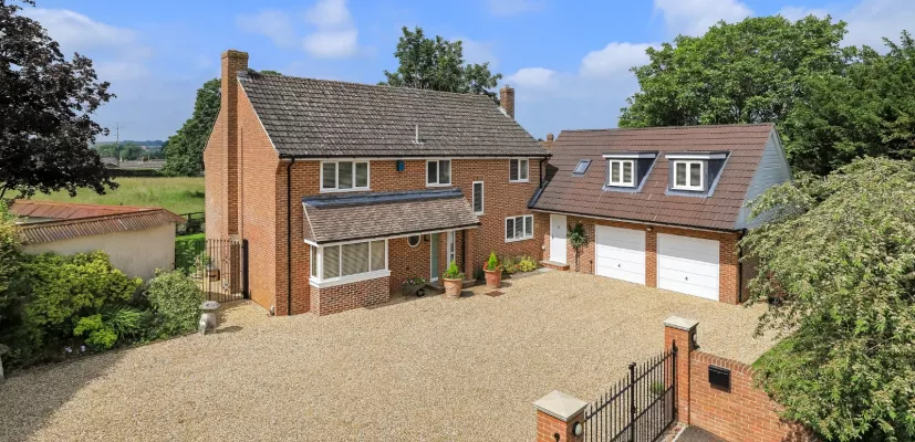 At the entrance to the property, gates open to the gravel driveway, where there is plenty of parking space, as well as access to the integrated double garage at the side. The front garden includes lawns flanking the driveway and mature hedgerow borders, while the rear offers a southwest-facing garden that enjoys sunshine from morning to evening. It includes a patio area for al fresco dining, with awn beyond, as well as border beds filled with various colourful flowering perennials and a peaceful pond, which is a haven for wildlife.
