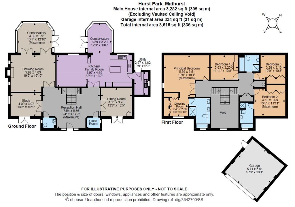 The kitchen area opens into a second conservatory, also with a vaulted glazed roof and French doors to the rear terrace, currently configured to provide a more informal breakfast/dining area. A feature imperial staircase rises from the reception hall to a first floor galleried landing with useful storage, giving access to an L-shaped principal bedroom with fitted dressing room and en suite bathroom. There are three further double bedrooms, all with fitted storage and one with an en suite bathroom, together with a family bathroom. There is potential to add a fifth bedroom off the principal.