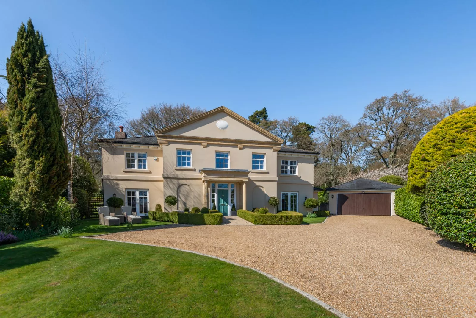 The drawing room has a feature fireplace and two sets of double doors to a conservatory with vaulted glazed roof and French doors to the rear terrace. The well-proportioned study and dining room both have French doors to the front garden.